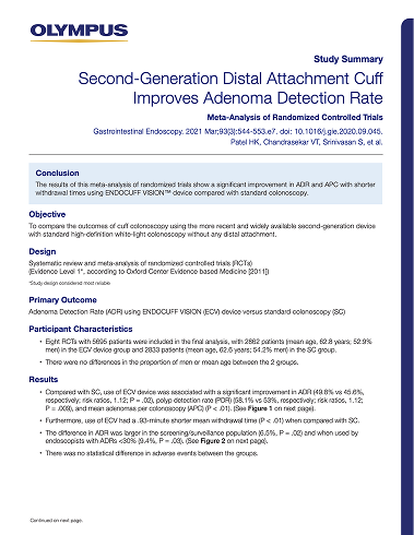• Patel HK, Chandrasekar VT, Srinivasan S, et al. Second-generation distal attachment cuff improves adenoma detection rate: meta-analysis of randomized controlled trials. Gastrointest Endosc. 2021;93(3):544-553.e7.