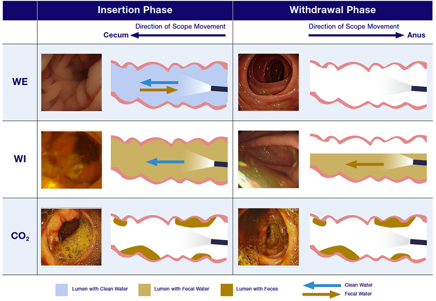 Water-aided colonoscopy (a.k.a. water-aided endoscopy, or water-based technique), is a practice employed to support scope advancement as an alternative to CO2  or air insufflation, with the added benefit of enhancing bowel cleanliness and providing a magnification effect of the colon.12
